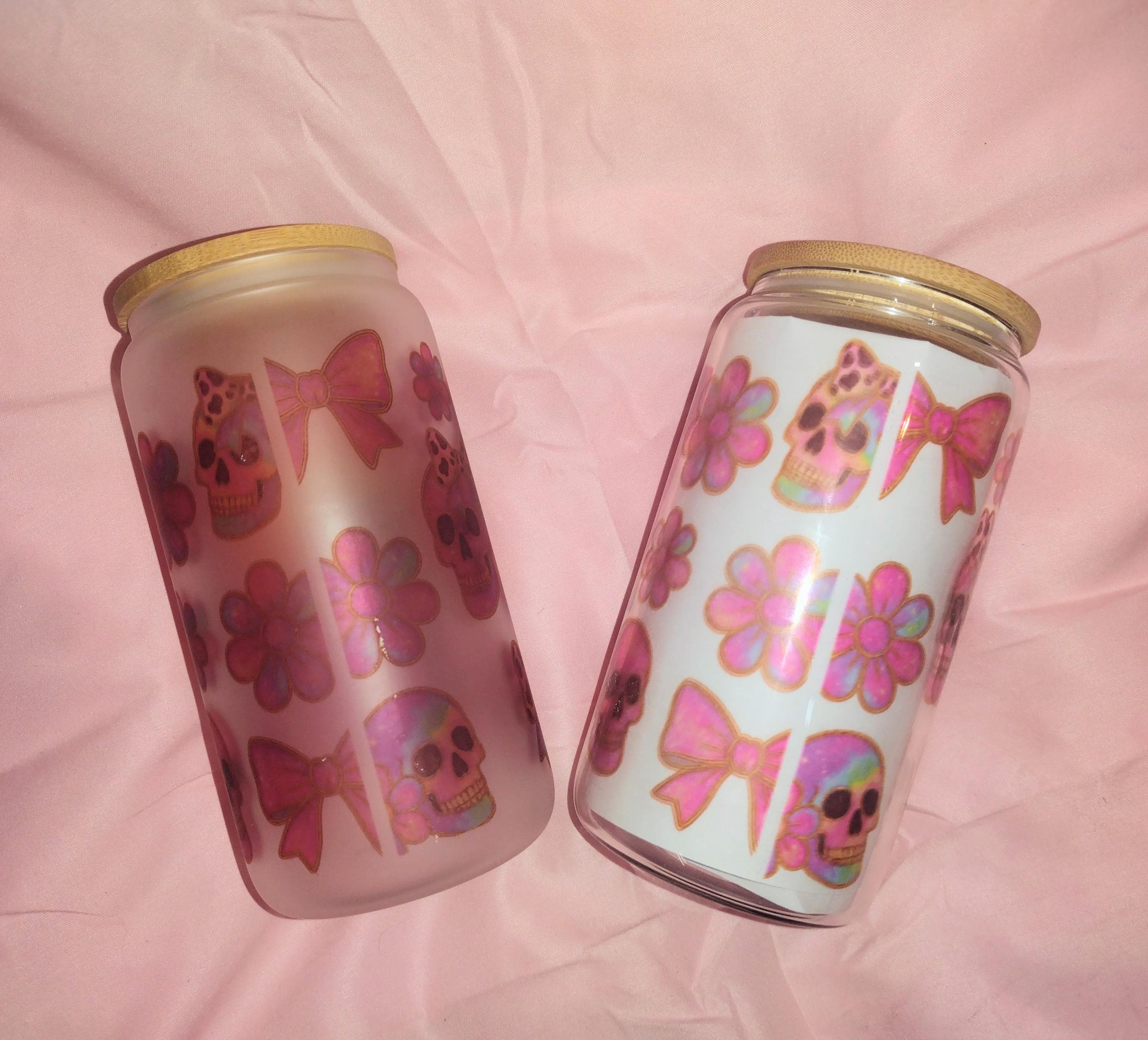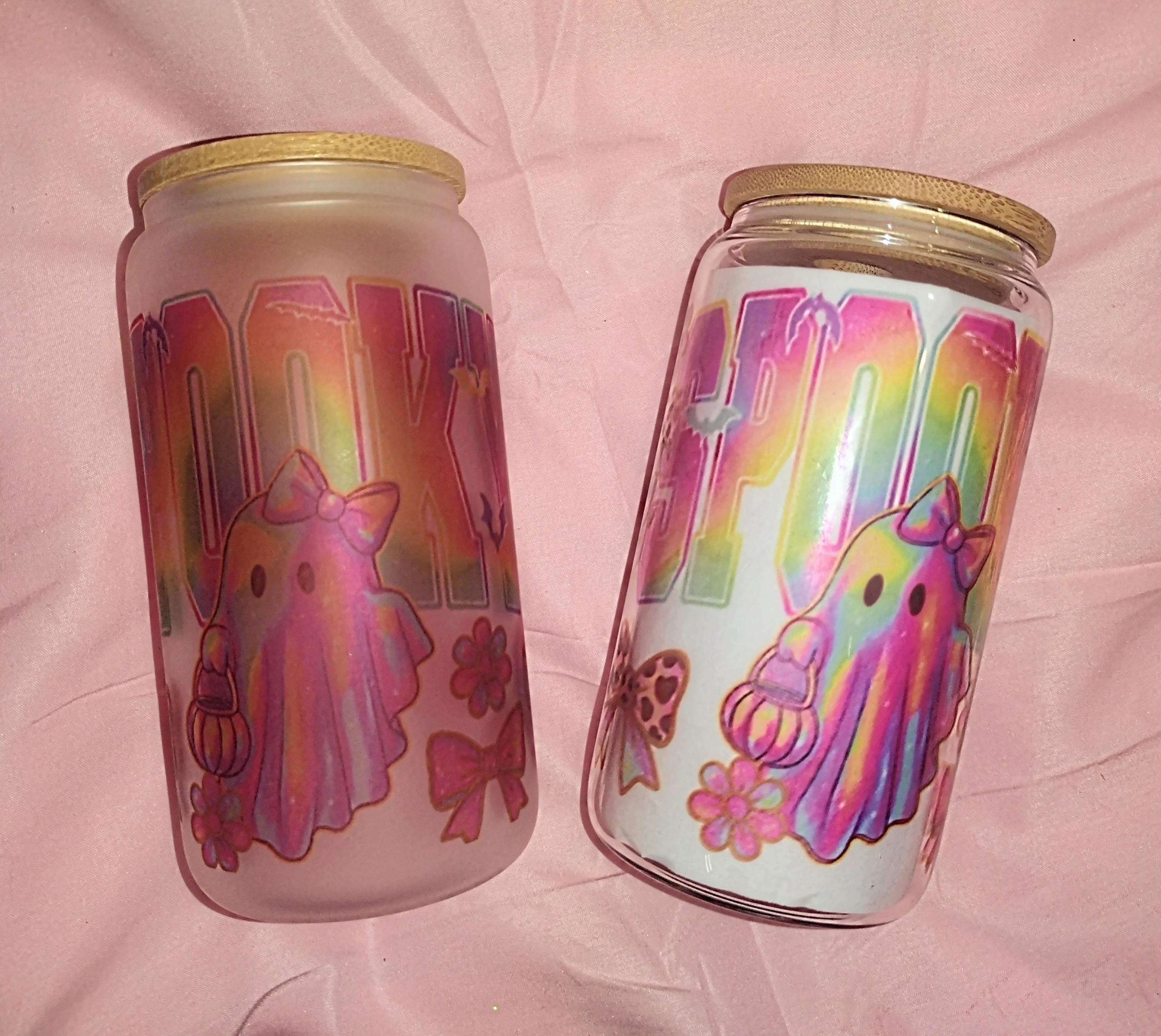 Bring pastel-goth vibes to your daily sips! This 16oz can-style glass features a rainbow “SPOOKY” ghost design with bows, skulls, and flowers—available in frosted or clear. Each cup is handmade and made to order in our small studio. Perfect for iced coffee, tea, or gift giving.