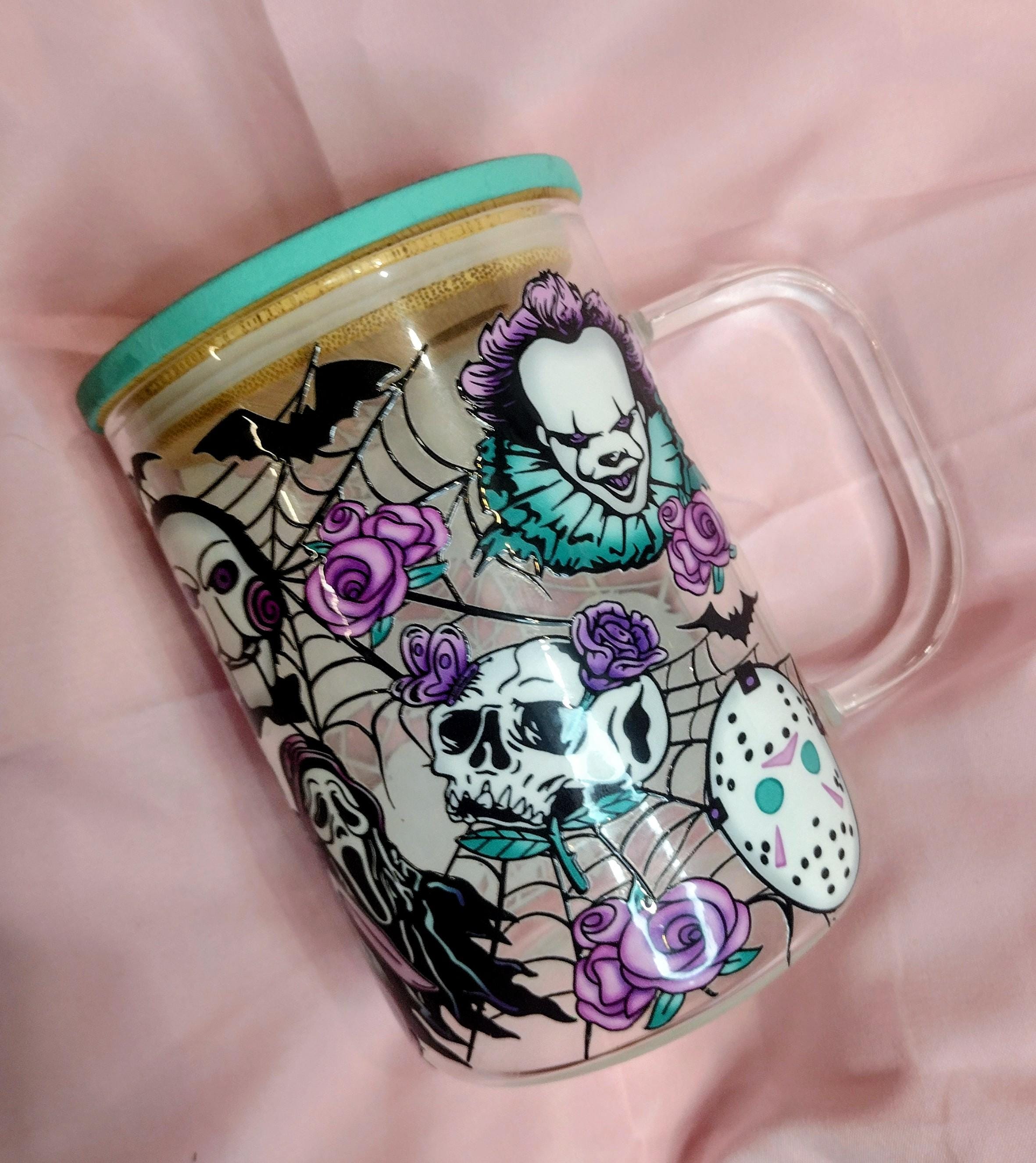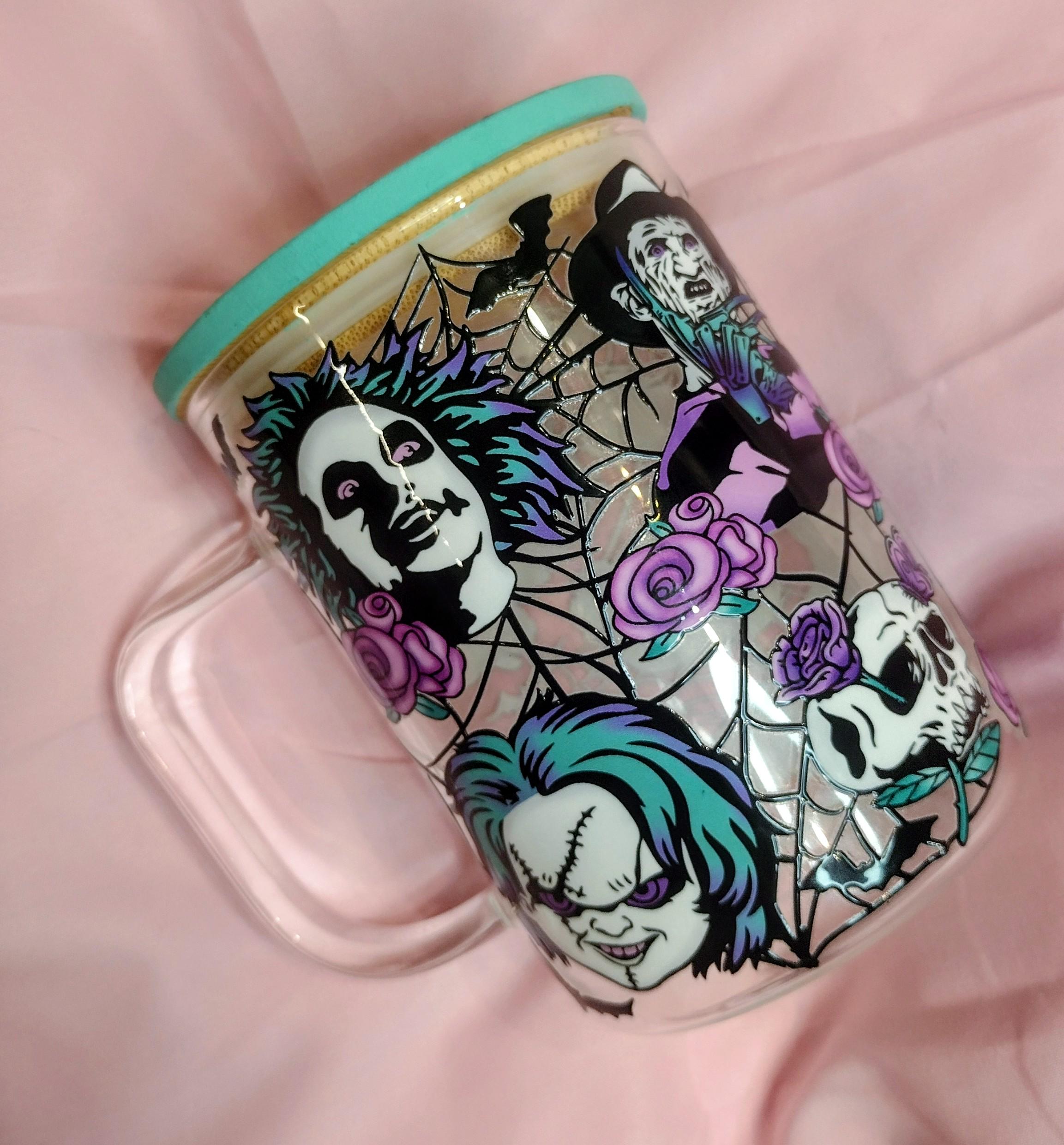 Meet your new spooky-cute favorite! This 16oz glass mug with handle features a pastel goth horror-inspired collage of webs, roses, and iconic scary-movie vibes—finished with a sparkly teal glitter lid topper for extra shimmer. Each piece is handmade and made to order in our small studio. Add a custom name to make it uniquely yours or gift it to a horror fan who loves a little glam with their scream.