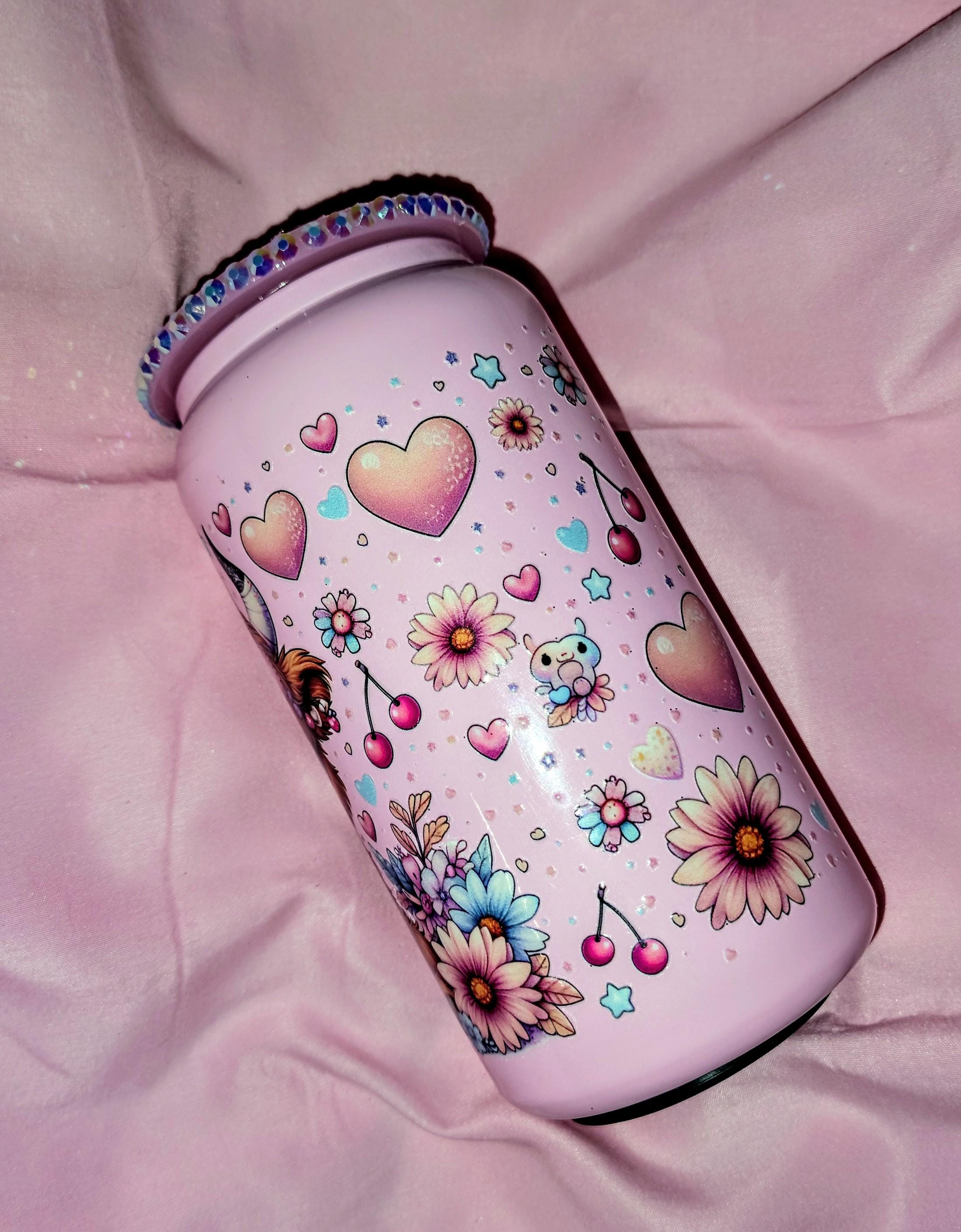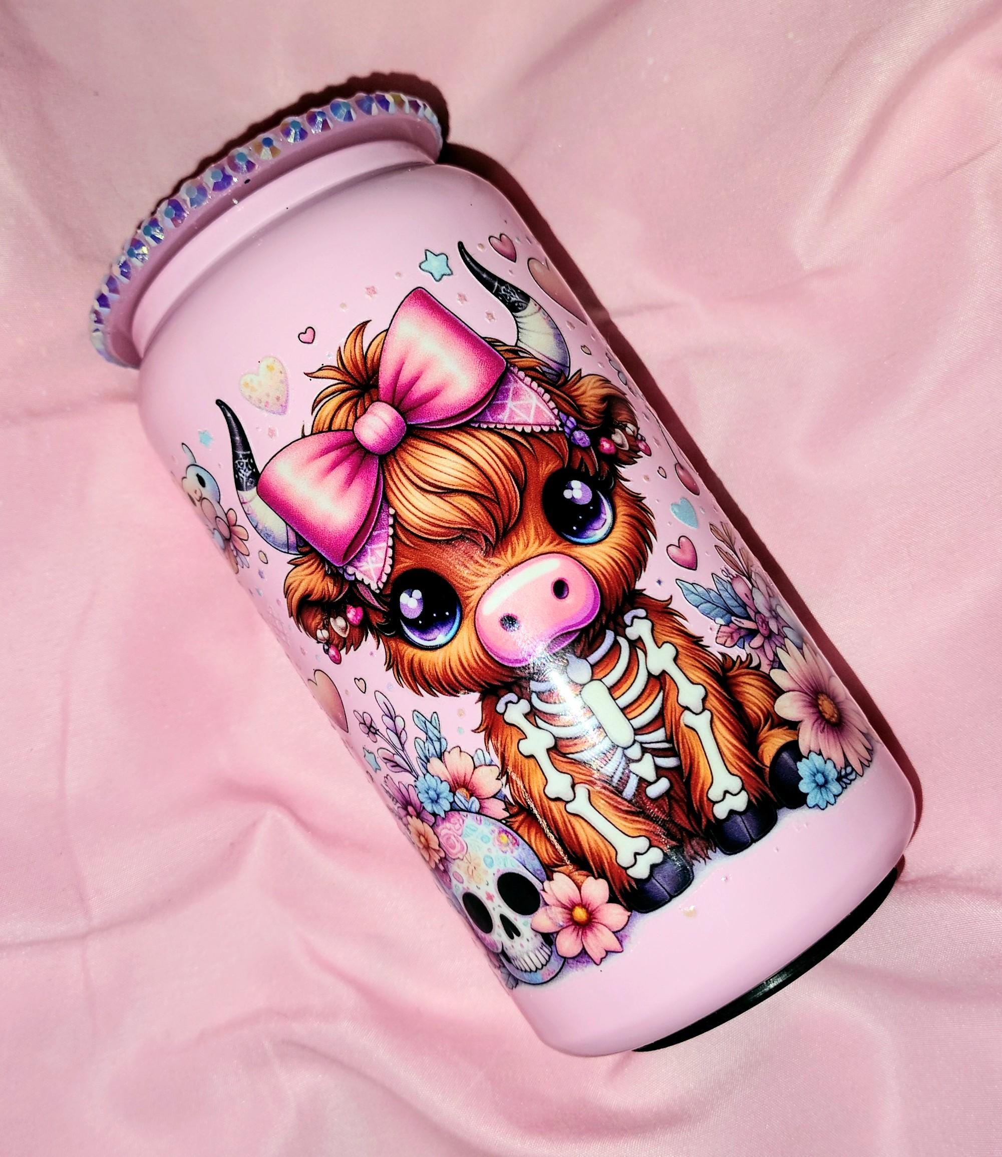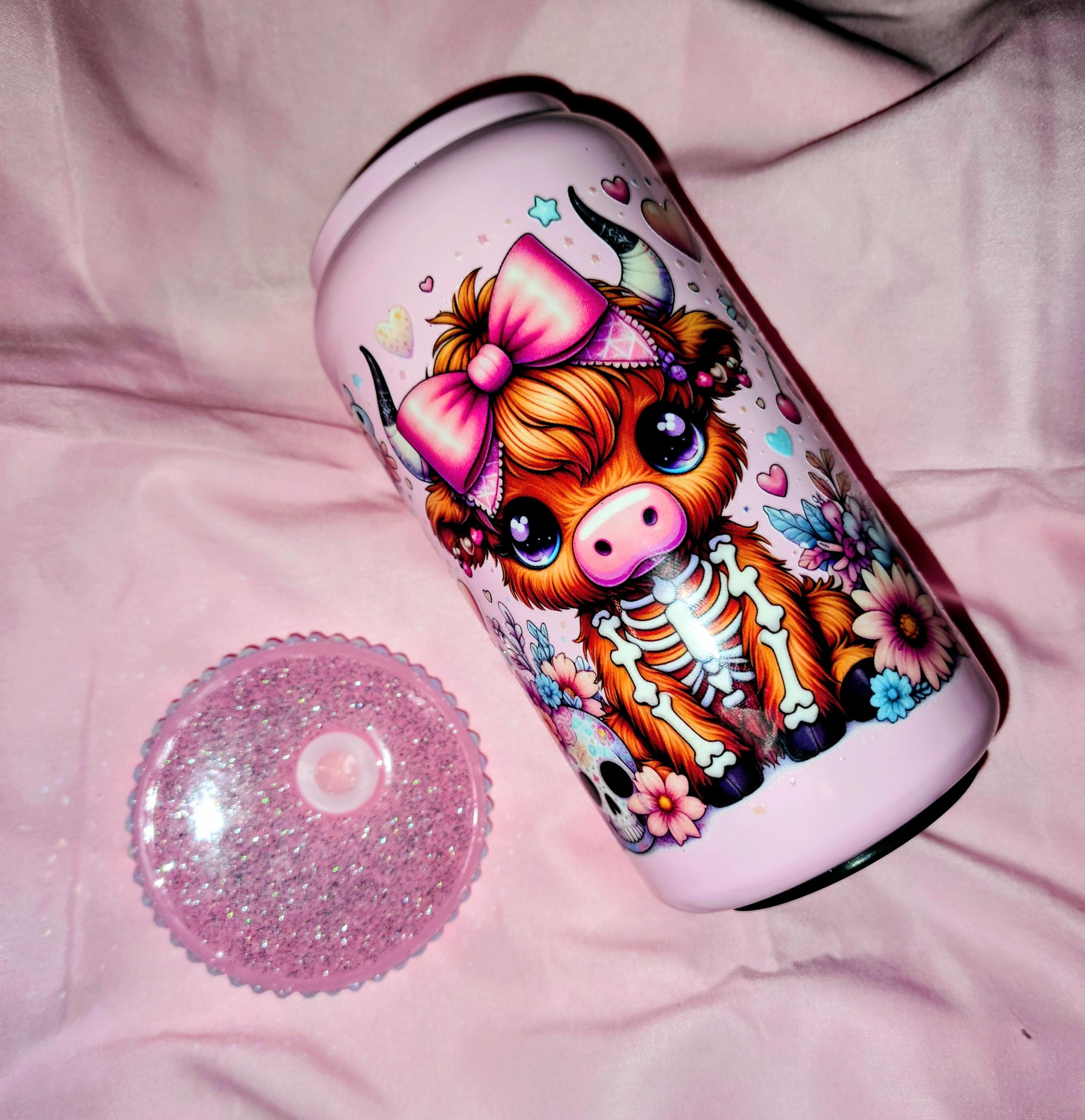 This 16oz stainless steel tumbler features an adorable pastel highland cow surrounded by flowers, hearts, and sparkles! With a matching pink glitter lid, this cup keeps your drinks hot or cold in style. Perfect for anyone who loves cute, girly, or cow-themed drinkware!