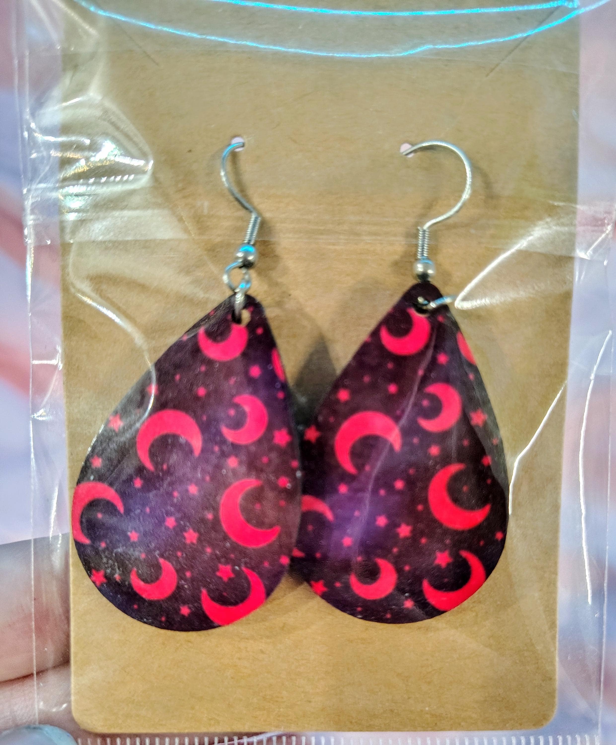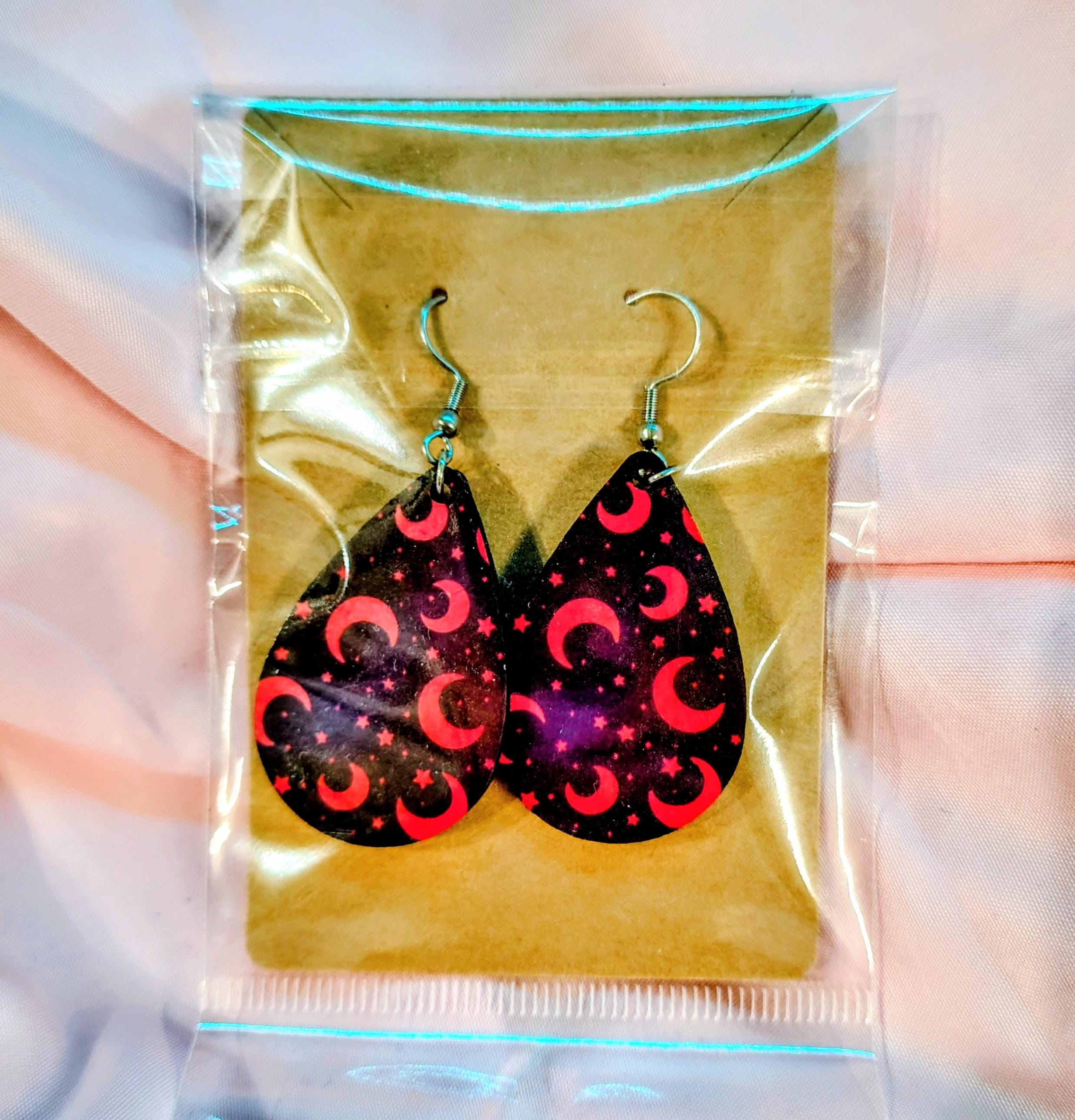 Featuring a bold pink crescent moon and star pattern on a dark background, these lightweight earrings are perfect for anyone who loves gothic, witchy, or celestial fashion.